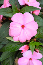 Light Pink New Guinea Impatiens features bold shell pink round flowers with pink eyes at the ends of the stems from mid spring to early fall. Its pointy leaves remain dark green in color throughout the season.