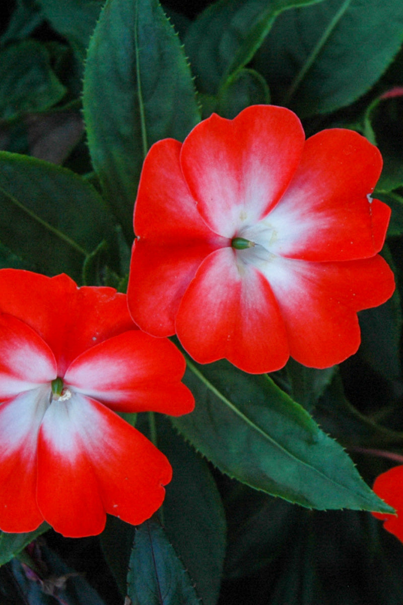 Orange Star New Guinea Impatiens features bold orange round flowers with white centers at the ends of the stems from mid spring to early fall. Its pointy leaves remain dark green in color throughout the season.