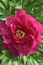Big double blooms have vibrant, deep magenta-red petals. Flowers are held closer to the foliage, creating a compact, rounded form that requires no staking. Mildew-resistant foliage stays attractive all season long. Perennial.