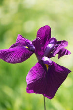 Big deep-purple flowers have a flag of bright yellow at the base of the petals. Blooms rise above the narrow green foliage on stiff stems - a great pick for cut flower arrangements. Excellent near water features, in damp borders, at the edge of ponds or streams, or even in pots plunged halfway to the rim in water gardens. An herbaceous perennial.