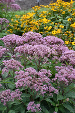 Euphoria™ Ruby Joe Pye Weed has masses of beautiful plumes of fragrant pink flowers at the ends of the stems from early summer to early fall, which emerge from distinctive ruby-red flower buds, and which are most effective when planted in groupings. The flowers are excellent for cutting. Its serrated narrow leaves remain forest green in color throughout the season. The burgundy stems are very colorful and add to the overall interest of the plant.