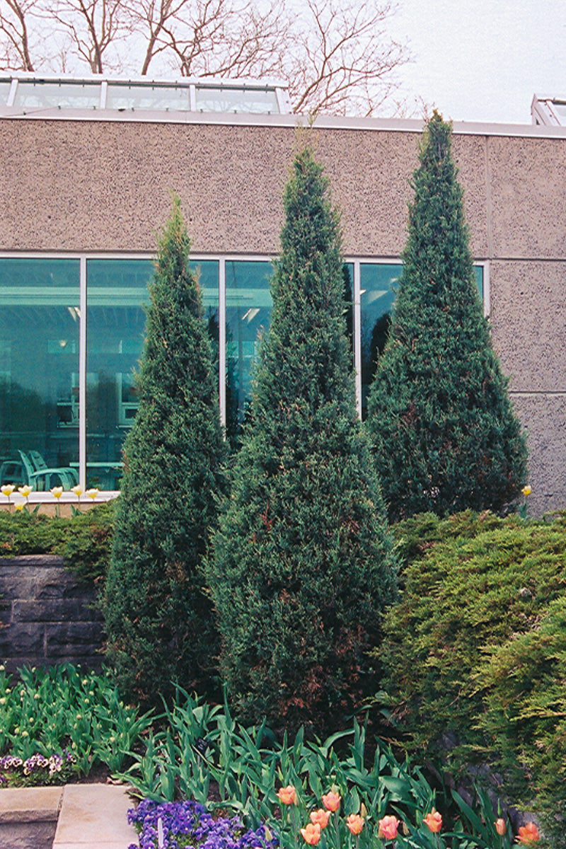 Skyrocket Juniper is a dwarf conifer which is primarily valued in the landscape for its rigidly columnar form. It has attractive powder blue evergreen foliage. The scale-like sprays of foliage are highly ornamental and remain powder blue throughout the winter. It produces silvery blue berries from late spring to late winter.