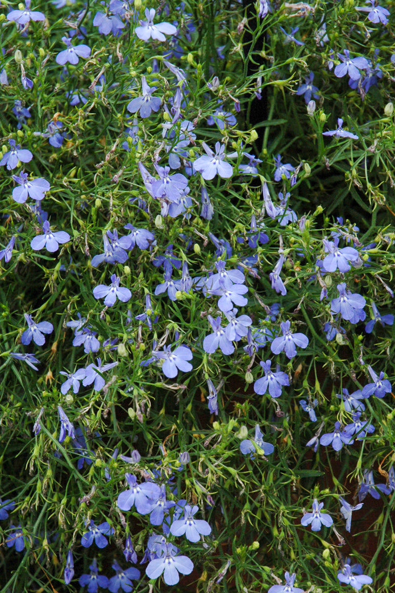 Trailing Blue Lobelia features dainty sky blue flowers with white eyes at the ends of the stems from mid summer to early fall. The flowers are excellent for cutting. Its pointy leaves remain green in color throughout the season.