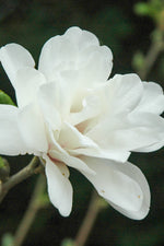 White Rose Magnolia is bathed in stunning fragrant double white cup-shaped flowers at the ends of the branches in mid spring, which emerge from distinctive pink flower buds before the leaves. It has dark green deciduous foliage. The pointy leaves turn coppery-bronze in fall. The fruits are showy green pods displayed from early to mid fall.