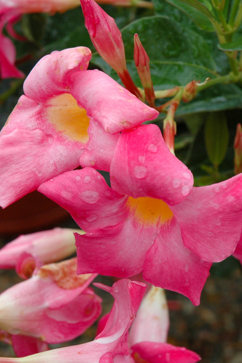 Sun Parasol ® Pink Mandevilla features bold pink tubular flowers with yellow throats along the branches from late spring to mid fall. Its glossy pointy leaves remain dark green in color throughout the year.