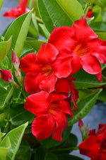 Deep velvet red flowers bloom early and abundantly against the dark, glossy green foliage of this tropical shrub-like vine. This particularly bushy variety can be supported with a trellis to add height, or left to form a dense mound. A great choice for hanging baskets or containers, with or without support. Evergreen in frost-free regions; treat as a summer annual in cooler regions.