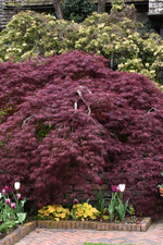 Tamukeyama Japanese Maple is primarily valued in the landscape or garden for its ornamental globe-shaped form. It features subtle corymbs of red flowers rising above the foliage in mid spring before the leaves. It has attractive burgundy deciduous foliage which emerges crimson in spring. The deeply cut ferny palmate leaves are highly ornamental and turn an outstanding red in the fall. The rough gray bark and red branches add an interesting dimension to the landscape.