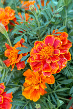 Safari Scarlet Marigold features bold scarlet pincushion flowers with gold eyes and gold edges at the ends of the stems from late spring to late summer. The flowers are excellent for cutting. Its fragrant ferny leaves remain dark green in color throughout the season.