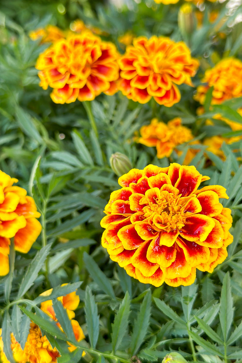 Safari Yellow Fire Marigold features bold yellow pincushion flowers with red spots at the ends of the stems from late spring to late summer. The flowers are excellent for cutting. Its fragrant ferny leaves remain dark green in color throughout the season.