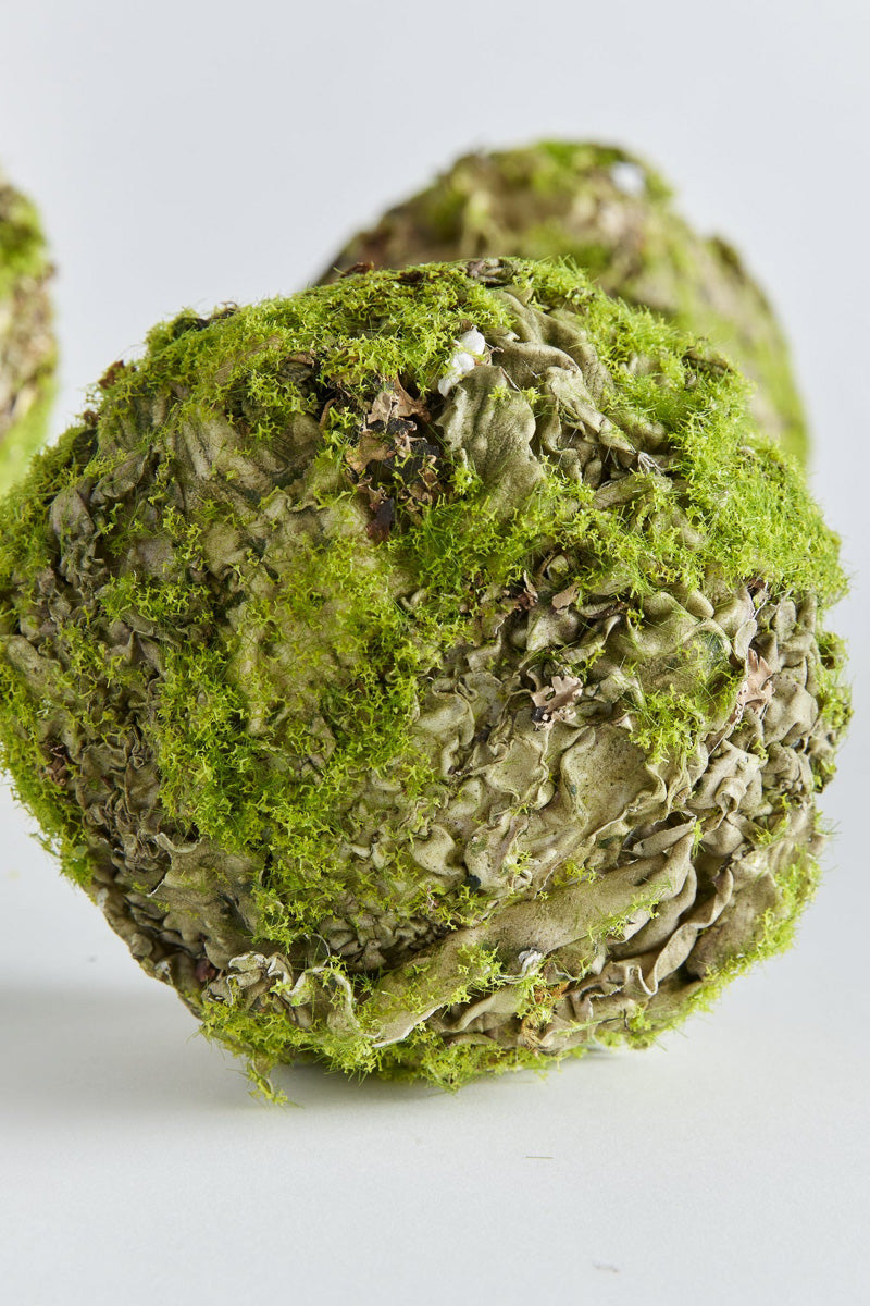 As if they were found in the depths of a lush forest, these mossy lichen orbs are expertly crafted. Scattered along a tablescape, or placed in a favorite low bowl, an effortless, natural look.