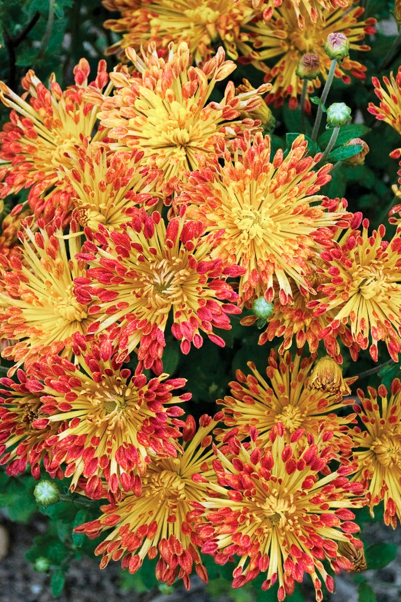 Matchsticks Chrysanthemum is smothered in stunning yellow daisy flowers with lemon yellow eyes and dark red tips at the ends of the stems from early to late fall. The flowers are excellent for cutting. Its fragrant ferny leaves remain green in color throughout the season.