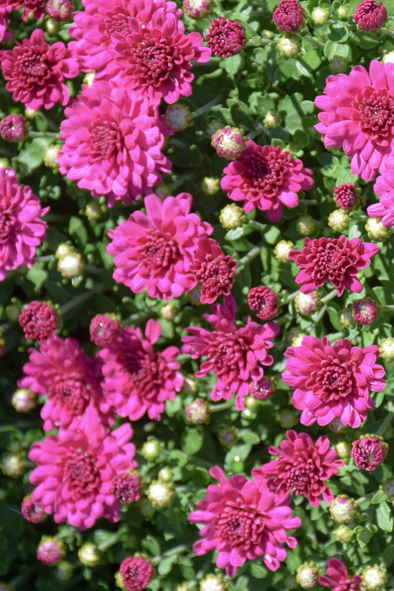 Cherry Purple Chrysanthemum is covered in stunning double fuchsia daisy flowers with purple overtones at the ends of the stems from early to mid fall. The flowers are excellent for cutting. Its fragrant ferny leaves remain dark green in color throughout the season.