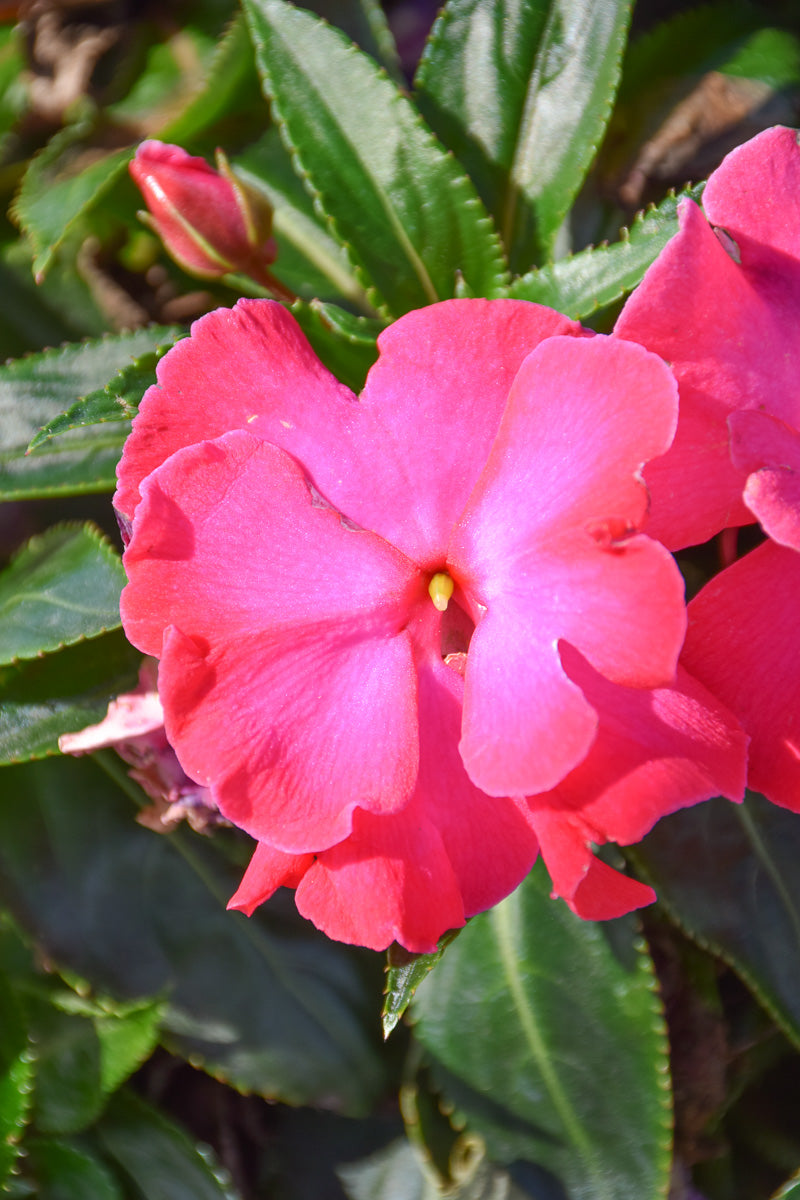 SunPatiens® Compact Hot Pink New Guinea Impatiens features bold hot pink round flowers at the ends of the stems from mid spring to early fall. Its pointy leaves remain dark green in color throughout the season.