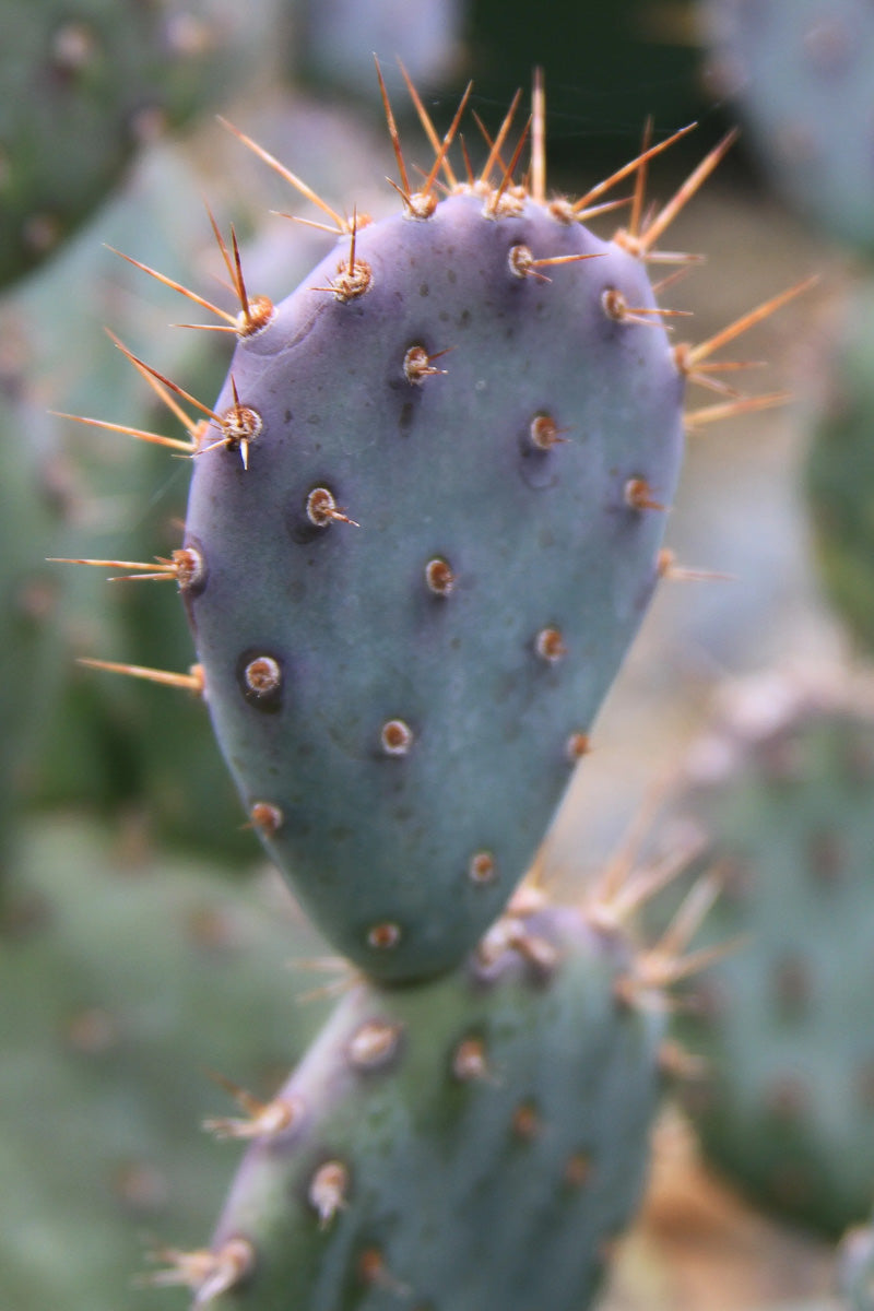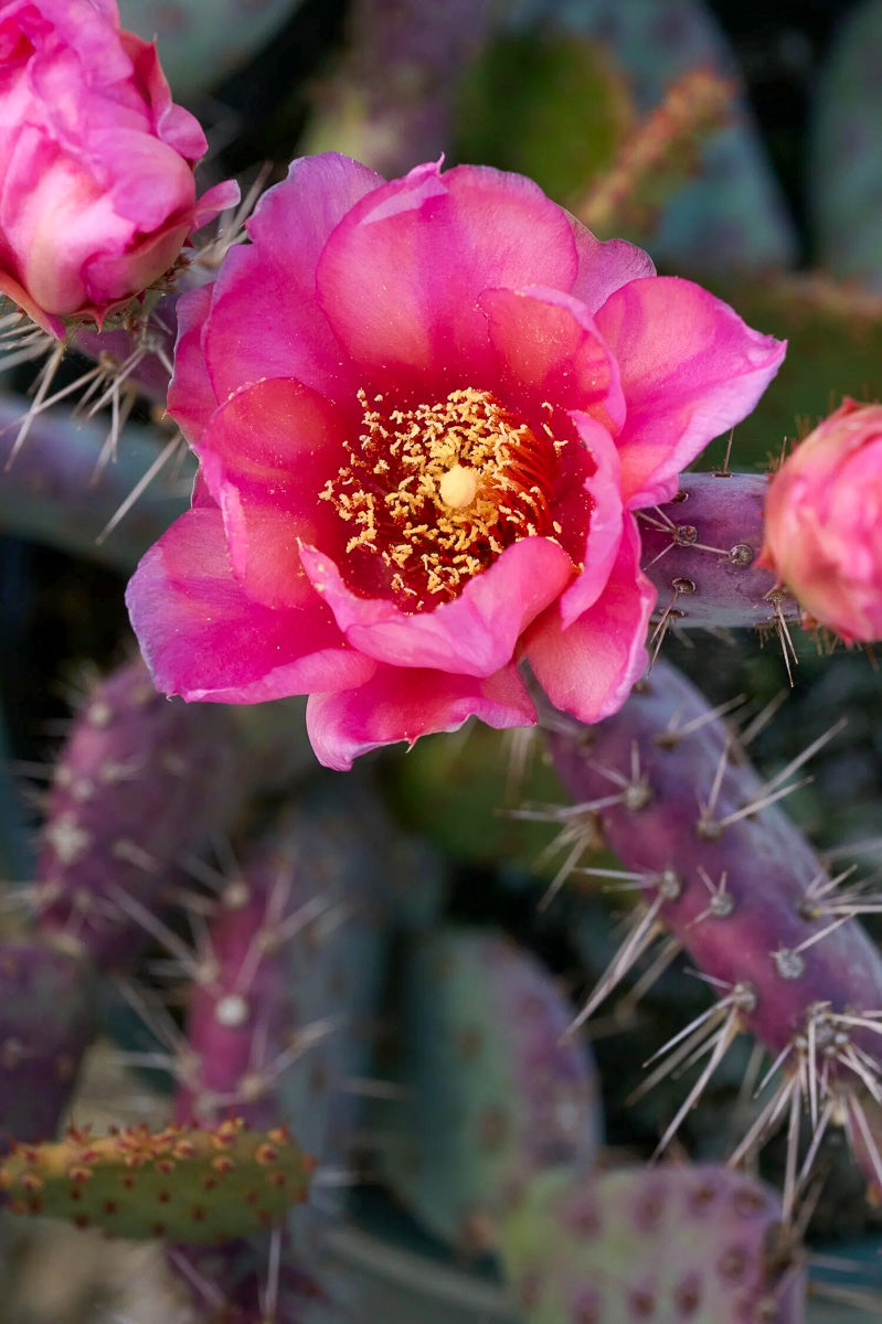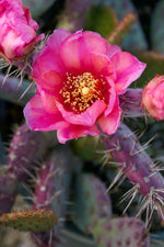 An exceptional heat-loving dwarf hybrid with brilliant carmine colored flowers in a small padded, purple-skinned prickly pear. Thrives in a range from coast to inland deserts, and even into high altitude mountain areas! Loaded with spring blooms, the blue-grey purple-tinged foliage color intensifies to a vibrant purple in winter. Evergreen.