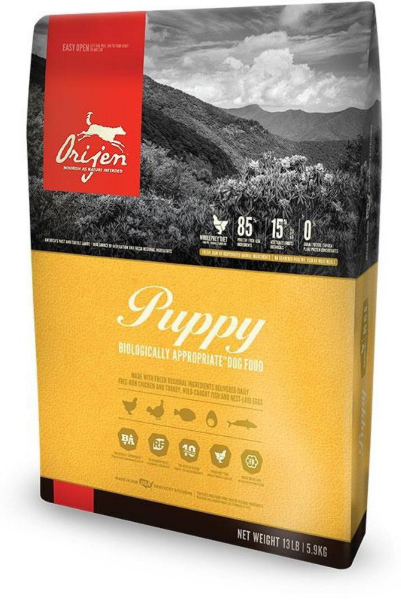 Unit price perBiologically appropriate grain free dog food with the highest quality deboned chicken, deboned turkey, yellowtail flounder, whole eggs, whole atlantic mackerel, and more locally sourced meats, fruits and vegetables make this food the tastiest and healthiest food for all four-legged taste testers. Puppies require a diet rich in proteins and fats from a variety of fresh whole meats to fully support their rapid growth and development. ORIJEN Puppy Dry Dog food contains 85% poultry, fish and eggs, 15% fruits and vegetables, and 0% grains, potatoes, or plant proteins. ORIJEN’s Puppy Recipe Dry Dog Food is sustainably farmed, and is so fresh, it’s actually rated for human consumption.
