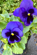 This pansy offers a dark blue flower with a deep purple blotch in the middle and golden yellow eyes, which look beautiful when all planted together in a group. Its crinkled round leaves remain green in color throughout the season.