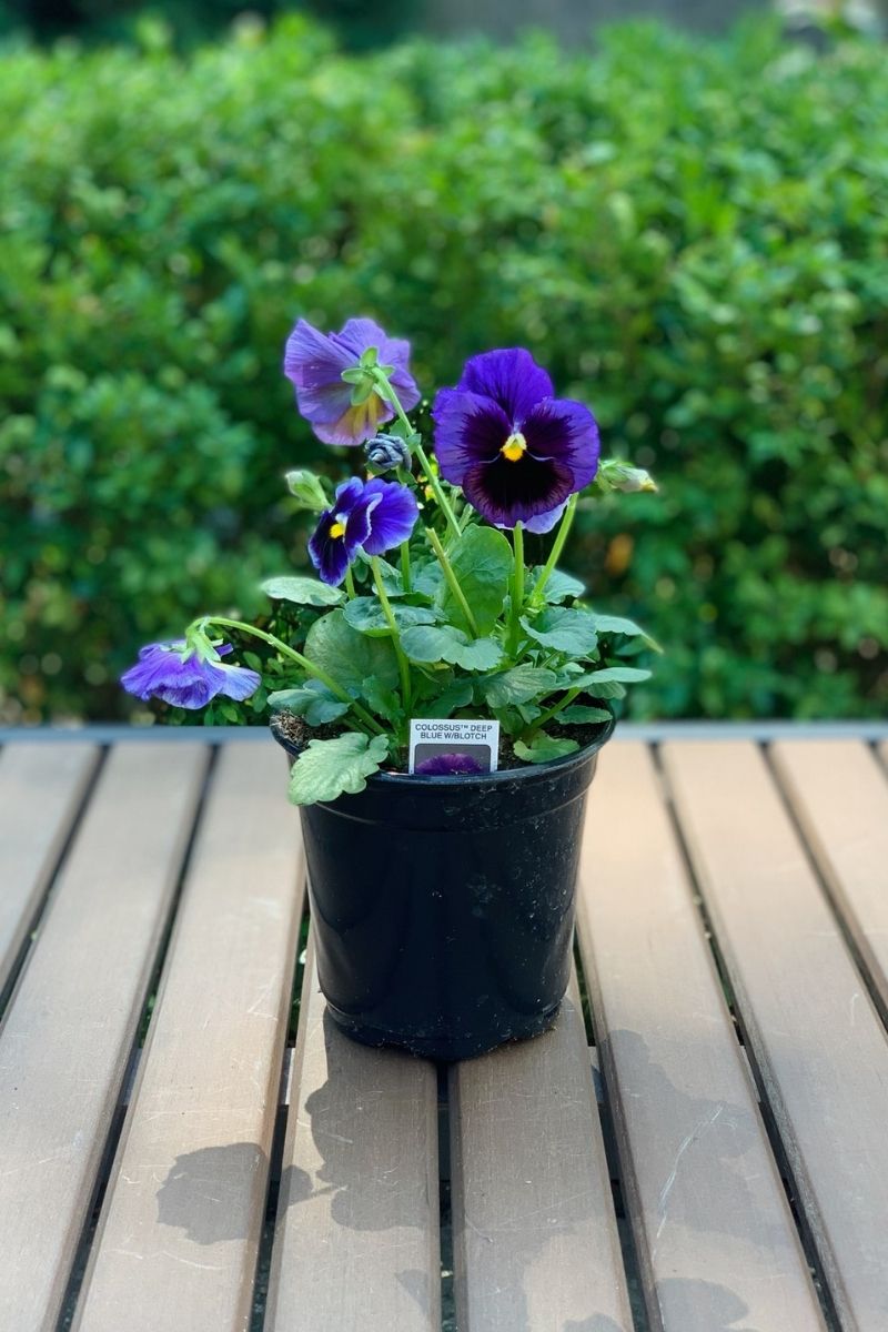 Colossus deep blue with blotch is a dramatic looking pansy sure to catch your eye. As it suggests, it is blue in color, and often looks deep purple. This popular series features extra large upward facing blooms, a tight plant habit and prevents stretching during warm conditions.