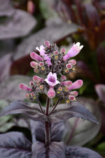 Dakota™ Burgundy Beard Tongue has masses of beautiful spikes of shell pink tubular flowers with lavender overtones, white throats and lavender streaks rising above the foliage from early to mid summer, which are most effective when planted in groupings. The flowers are excellent for cutting. Its attractive serrated pointy leaves emerge brick red in spring, turning burgundy in color with showy dark green variegation and tinges of crimson. As an added bonus, the foliage turns a gorgeous dark red in the fall. The dark red fruits with black overtones are held in abundance in spectacular clusters from late summer to early winter. The dark red stems are very colorful and add to the overall interest of the plant.