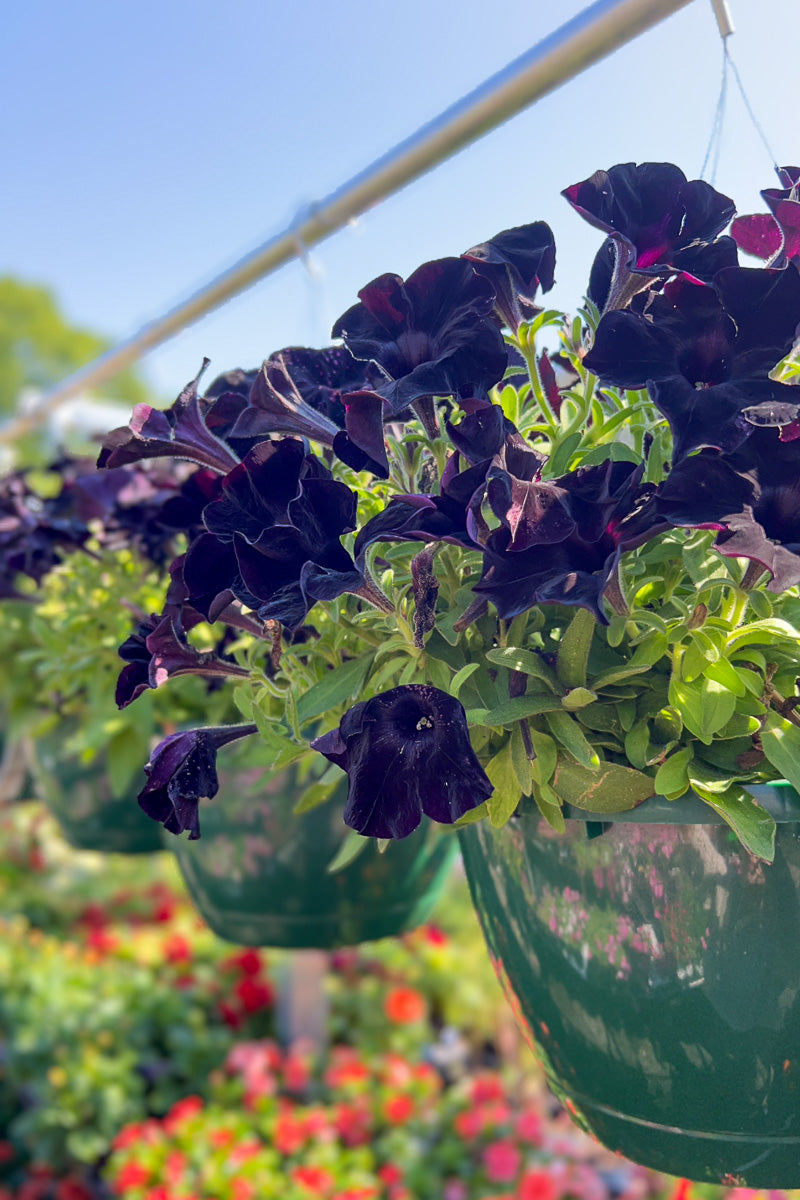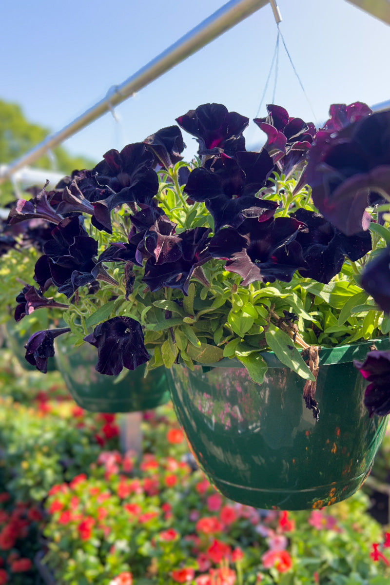 Black Ray Petunia is covered in stunning velvety black trumpet-shaped flowers at the ends of the stems from mid spring to mid fall. Its pointy leaves remain green in color throughout the season.