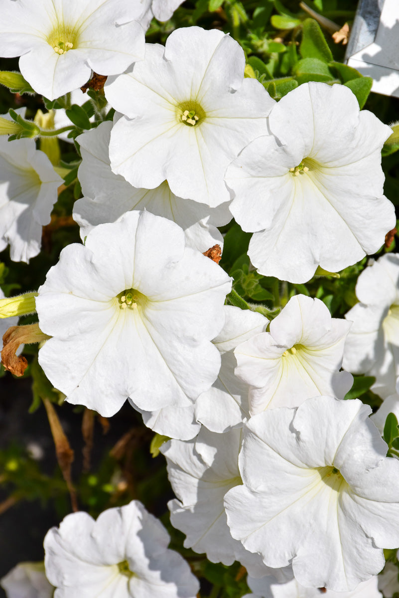 Wave® White Petunia is draped in stunning white trumpet-shaped flowers at the ends of the stems from mid spring to late summer. Its pointy leaves remain green in color throughout the season.