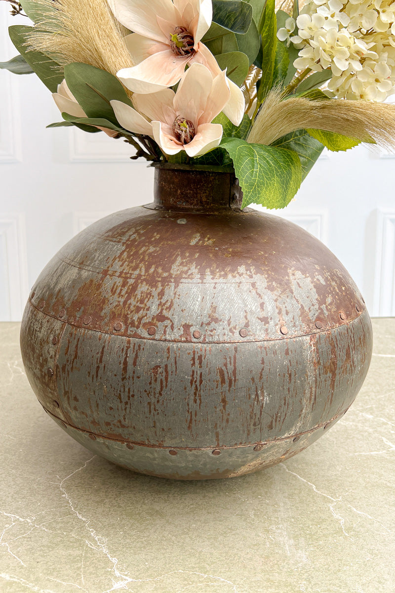 This rustic water jug adds textural detail alone or with a floral arrangement.