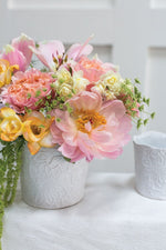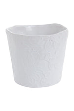 In simple glossy white glaze and a floral pattern in relief, the Priscella Pot is a simple and elegant ceramic piece.