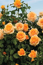 Bred from renowned roses Autumn Sunset and Julia Child, this rose delivers a profusion of gorgeous golden yellow blooms with a fruity scent that attracts humans and pollinators alike. Disease resistant and vigorous, it can reach 10′ on a trellis or pergola.