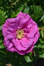 Lotty's Love® Rose features showy fragrant semi-double fuchsia flowers with purple overtones and buttery yellow eyes at the ends of the branches from late spring to mid fall. The flowers are excellent for cutting. It has dark green deciduous foliage. The glossy oval compound leaves turn an outstanding scarlet in the fall. The fruits are showy red hips displayed from mid to late fall. The spiny brick red bark adds an interesting dimension to the landscape.
