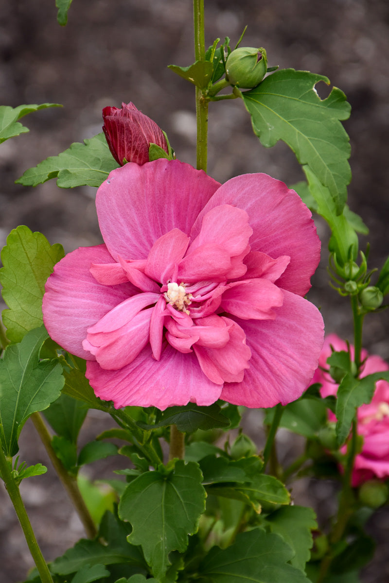 Magenta Chiffon® Rose Of Sharon features bold fuchsia round flowers with purple overtones and creamy white anthers along the branches from early summer to early fall, which emerge from distinctive crimson flower buds. It has dark green deciduous foliage. The lobed leaves do not develop any appreciable fall color.