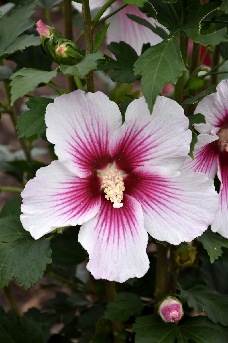 Paraplu Pink Ink® Rose of Sharon features bold white trumpet-shaped flowers with crimson throats and hot pink veins along the branches from mid summer to early fall. It has green deciduous foliage which emerges light green in spring. The lobed leaves turn yellow in fall.