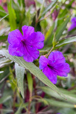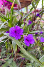 Purple, petunia-like flowers appear continuously throughout the warm season on broad clumps of tall, upright, woody stems with narrow, elongated, dark green leaves. Plant towards the rear of a border or as an accent in a mixed container. Versatile and adaptable to varied conditions. Perhaps too adaptable to wetter conditions, where it can spread aggressively. However, it is an excellent option for dry, harsh conditions where many plants can't survive. An herbaceous perennial.