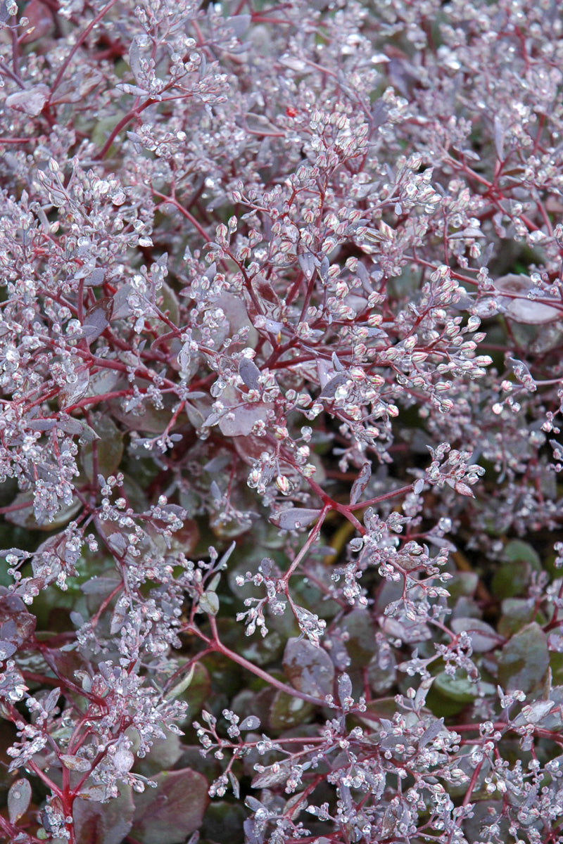 Bertram Anderson Stonecrop features airy clusters of burgundy flowers with white overtones at the ends of the stems from early to late summer. Its attractive succulent round leaves emerge burgundy in spring, turning deep purple in color throughout the season. The burgundy stems are very colorful and add to the overall interest of the plant.