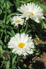 Crazy Daisy Shasta Daisy has masses of beautiful white daisy flowers with yellow eyes at the ends of the stems from early to late summer, which are most effective when planted in groupings. The flowers are excellent for cutting. Its serrated narrow leaves remain dark green in color throughout the season.