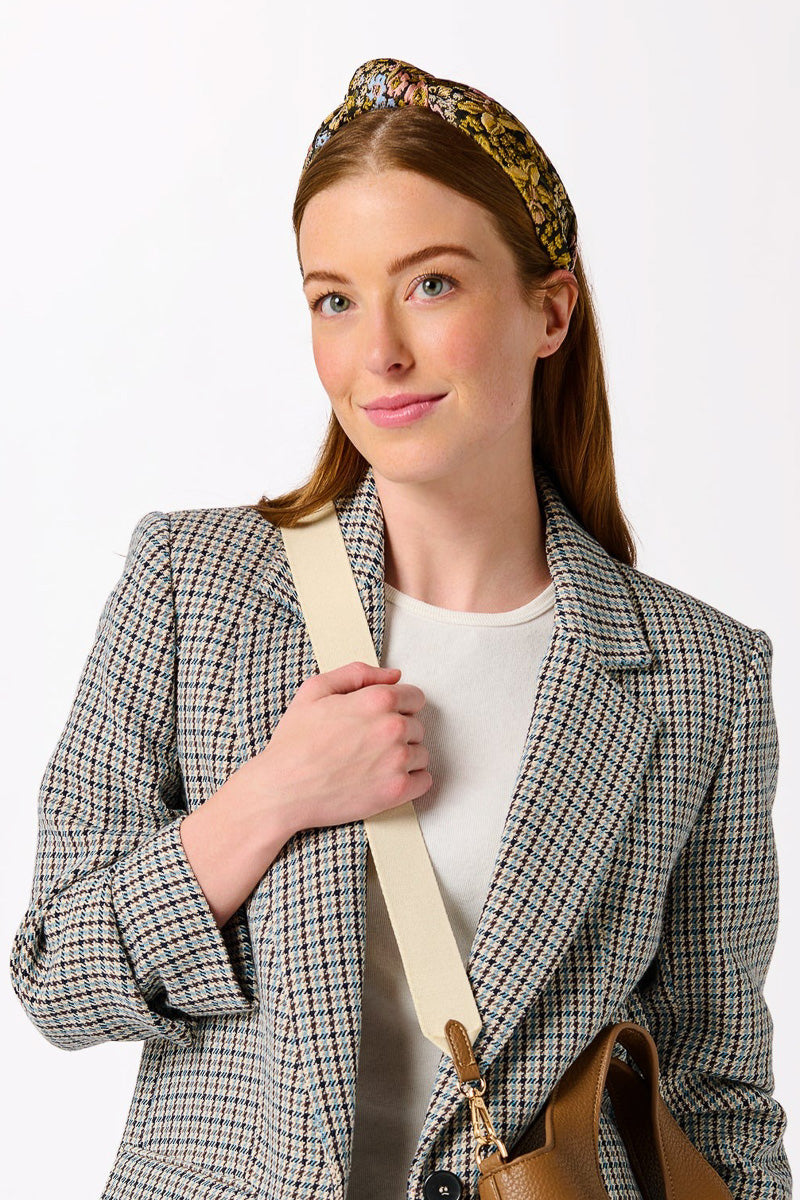 Unit price perAdd a pop of vintage charm to your look with our Floral Jacquard Headband. This statement piece features a luxe, textured fabric woven with a beautiful tapestry of mustard, blush, and soft blue blooms. The structured knot detail and wide band offer a flattering fit that stays comfortable from coffee runs to cocktail hour. Whether your hair’s up, down, or somewhere in between, this headband effortlessly ties your whole outfit together.