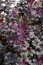 Foliage on this outstanding dwarf variety emerges rich purple, progresses to deep near-black as summer heat comes on, then lightens up in shades of red and orange in fall; large, soft panicles of bloom in early summer has the appearance of smoke