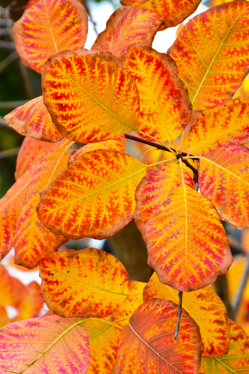 American Smoketree features airy panicles of yellow flowers at the ends of the branches from early to late summer. It has bluish-green foliage throughout the season. The round leaves turn an outstanding orange in the fall. The fruit is not ornamentally significant. The warty gray bark adds an interesting dimension to the landscape.