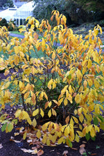 An uncommon shrub with many ornamental qualities; radiant yellow flowers in early spring before the leaves followed by showy red berries in fall, beautiful gold fall color and fragrant foliage; a shapely garden shrub, blends nicely into natural settings