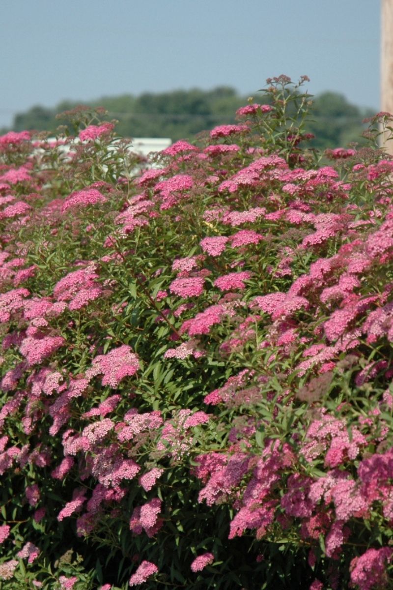 A broadly spreading garden shrub featuring attractive clusters of carmine-red flowers offset against the foliage, turns purple in fall; very low maintenance plant, excellent in groupings, needs full sun and well-drained soil. Anthony Waterer Spirea features showy clusters of rose flowers at the ends of the branches from late spring to early summer. It has attractive bluish-green foliage which emerges brick red in spring.