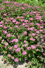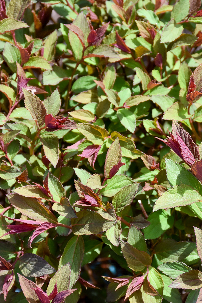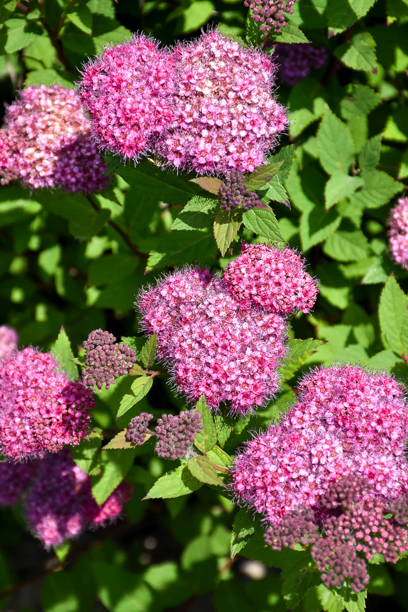 Double Play Artist Spirea features showy clusters of pink flowers with hot pink eyes at the ends of the branches from mid spring to mid summer. It has green deciduous foliage which emerges coppery-bronze in spring. The serrated pointy leaves turn an outstanding brick red in the fall.
