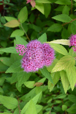 Double Play® Candy Corn® Spirea features showy clusters of purple flowers at the ends of the branches from late spring to early summer. It has attractive yellow foliage with hints of orange which emerges cherry red in spring. The small serrated pointy leaves are highly ornamental and turn an outstanding coppery-bronze in the fall.
