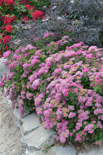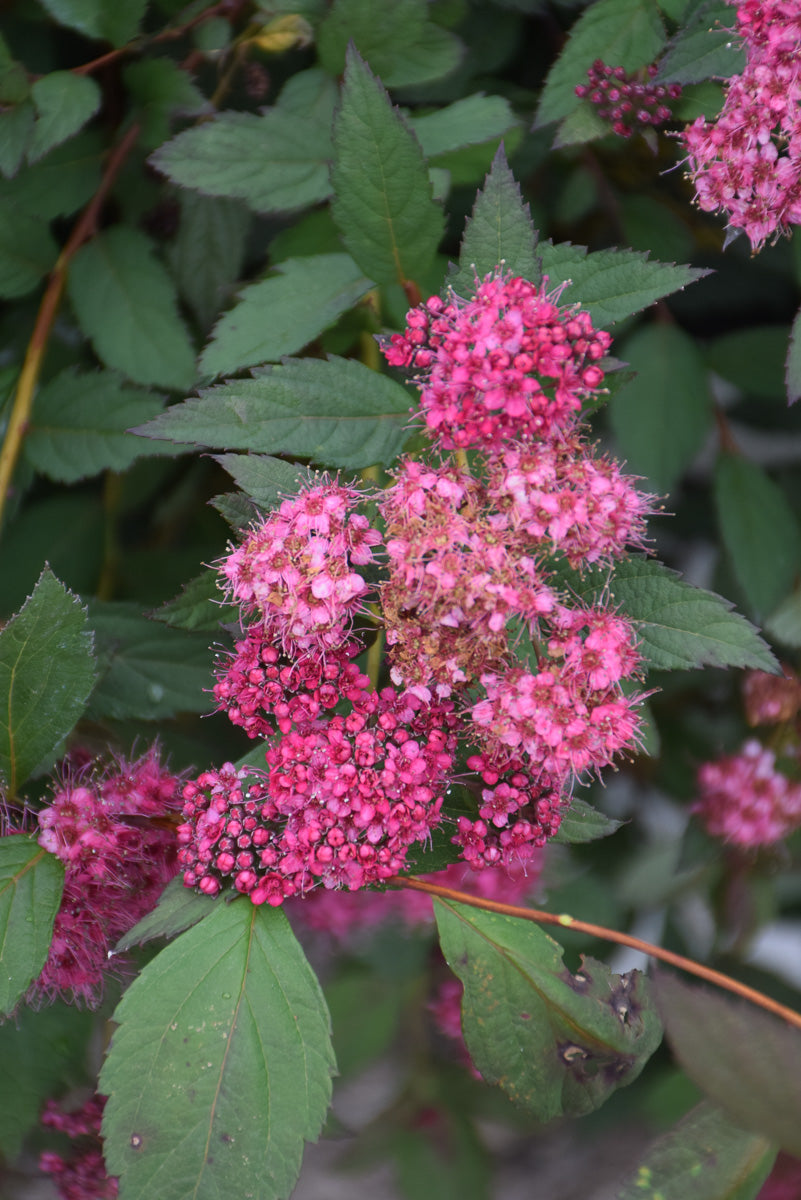 Double Play® Pink Spirea features showy clusters of hot pink flowers at the ends of the branches from late spring to early summer, which emerge from distinctive brick red flower buds. It has forest green deciduous foliage which emerges burgundy in spring. The serrated pointy leaves turn an outstanding brick red in the fall.