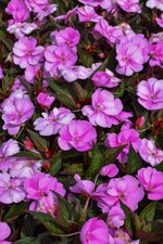 SunPatiens® Vigorous Lavender Splash New Guinea Impatiens features bold lavender round flowers with hot pink overtones at the ends of the stems from mid spring to early fall. Its pointy leaves remain dark green in color throughout the season.