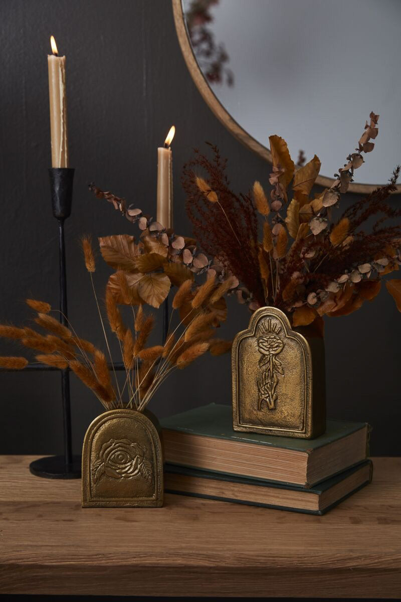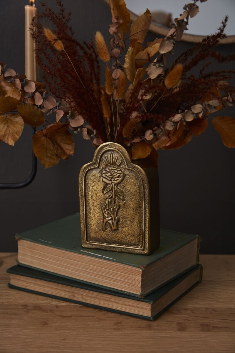 Bring a bit of delightful dread to your Halloween decor with the Til Death Budvase Collection. These recycled cast aluminum tombstone-shaped budvases feature intricate, dimensional designs—a skeleton hand holding a rose with the phrase "memento mori", and an eyeball inside a rose with the phrase "love you to death." Each budvase is perfect as a vessel for a few dried or fresh stems and serves as a spooky decorative object that can be layered together.