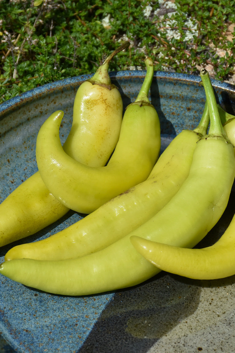 Sweet Banana Pepper is an annual vegetable plant that is typically grown for its edible qualities. It produces yellow peppers (which are technically 'berries') which can be harvested at any point. The peppers have a mild taste and a crunchy texture.