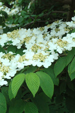 Shasta Doublefile Viburnum is clothed in stunning white lacecap flowers held atop the branches in mid spring. The red fruits are held in abundance in spectacular clusters from mid summer to early fall. It has dark green deciduous foliage. The serrated pointy leaves turn an outstanding brick red in the fall.