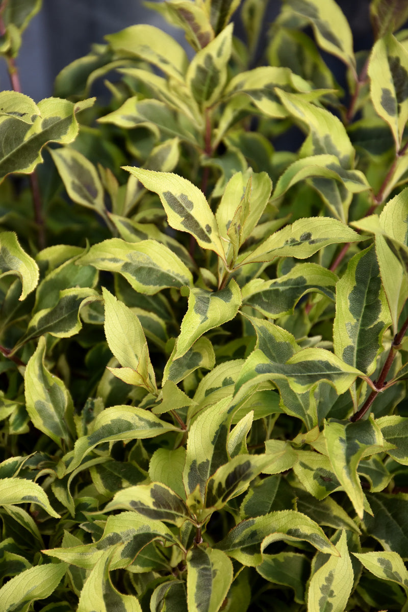 Bubbly Wine® Weigela features showy clusters of rose trumpet-shaped flowers with pink overtones along the branches in late spring. It has attractive yellow-variegated dark green foliage with hints of burgundy. The pointy leaves are highly ornamental and turn an outstanding burgundy in the fall.