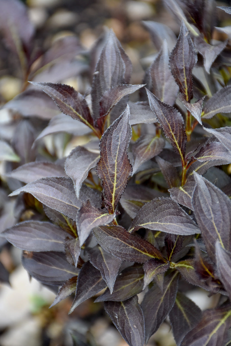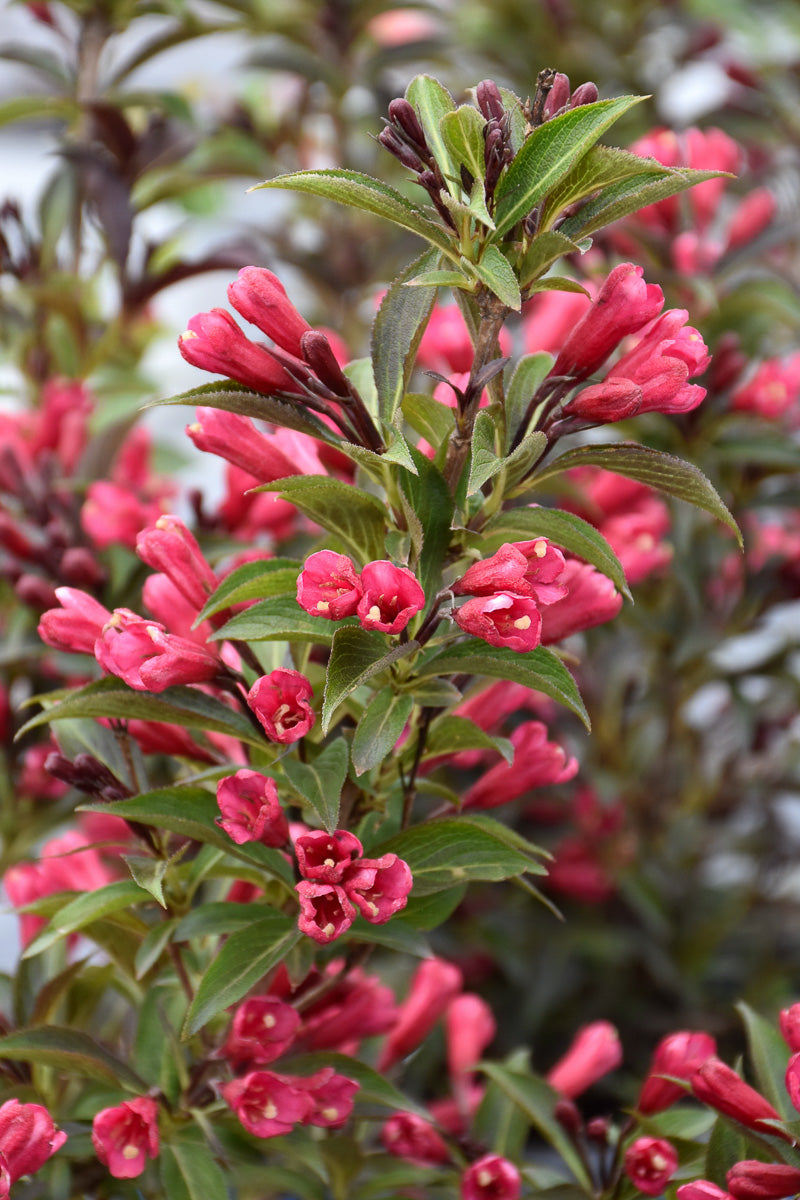 Electric Love® Weigela is draped in stunning clusters of red bell-shaped flowers along the branches from mid spring to late summer. It has attractive plum purple foliage with hints of black. The serrated pointy leaves are highly ornamental but do not develop any appreciable fall color.