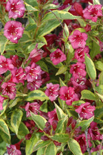 French Lace Weigela is draped in stunning clusters of dark red trumpet-shaped flowers along the branches in late spring. It has attractive yellow-variegated green foliage with hints of deep purple. The pointy leaves are highly ornamental but do not develop any appreciable fall color.