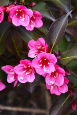 A flamboyant spring-flowering shrub, Wine and Roses Weigela features showy clusters of hot pink trumpet-shaped flowers along the branches in late spring. Its attractive, deep wine-colored foliage maintains color throughout the season.