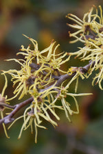 Common Witchhazel has fragrant yellow strap-like flowers along the branches in late fall before the leaves, which are interesting on close inspection. It has green deciduous foliage. The serrated round leaves turn an outstanding yellow in the fall.
